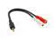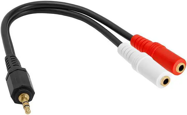 It has a male 3.5mm (1/8) stereo mini plug on one end (the one you use to plugs into headphones, a walkman, portable CD/DVD player, MP3 player, computer, iPod etc.) , and two color coded Stereo female 3.5mm jacks on the both ends.