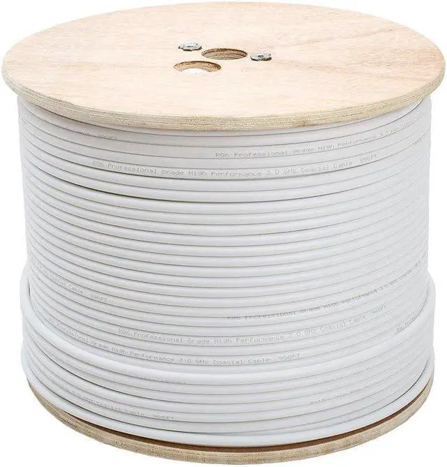 RG6 Cable - Standard Shield (White),500 Feet. RG6 Standard Shield Cable is great for Hi-Impact Acoustics, antennas, cable television and satellite installations. With its durable aluminum-Mylar shield and 60 Percentage aluminum braid, you get up to 3.0GHz performance at applicable frequencies. Available in both white and black. 18AWG, IMP: 75-OHM. 100 Percentage Aluminum-Mylar Shielding. 60 Percentage Aluminum Braid. 16/4/0.12 Aluminum Stranding. Gas Injected Foam Polyethylene Insulation. 6.0+/-0.15mm Outer Diameter. CM/CL2 Rated PVC Jacket. Sweep Tested to 3.0GHz. Sequential Foot Markers. CMR Rated. UL Listed.