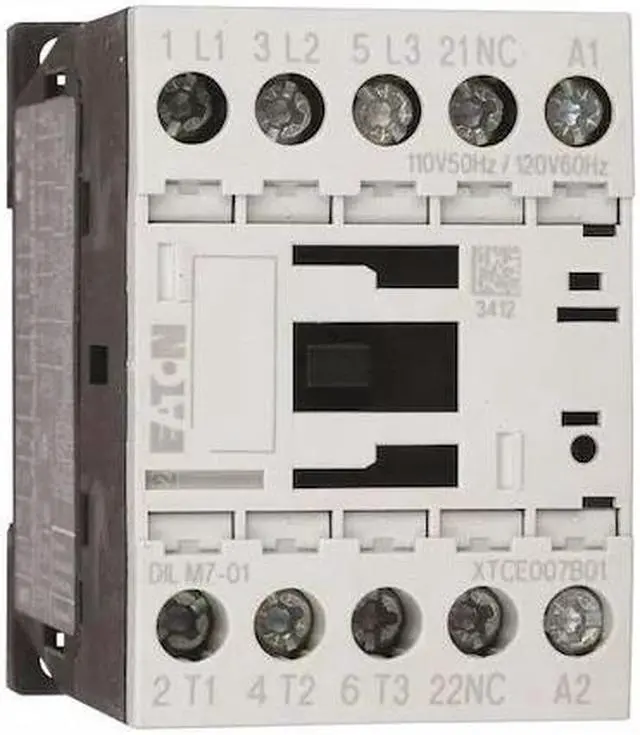 IEC Magnetic Contactor, Auxiliary Contact Form 1NC, NEMA Enclosure Rating No Enclosure, NEMA Size Not Applicable, Coil Voltage 24V DC, Number of Poles 3, Full Load Current - Inductive 7 A, Full Load Current - Resistive 22 A, Reversing Capability Non-Reversing, Overall Height 3 in, Overall Width 1.77 in, Terminal Connection Type Screw Terminals, Frame Size B, Mounting Style DIN Rail, Panel, Series XT, Number of Auxillary Contacts 1, Contactor Style IEC, Horsepower @ Three Phase - 240V AC 2 hp.
