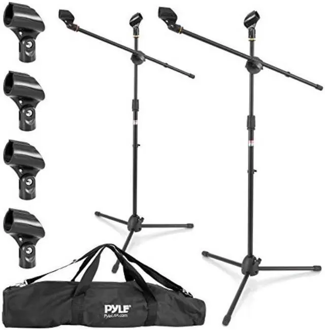 The Pyle Universal Tripod Microphone Stands - Adjustable & Extendable set of 2 - Glossy Black Finish - Anti-Slip Tripod Legs - Comes with 2 Mic Stands - Lock-Tight Tension Knob - (2) M-6 Microphone Holder Included - Reinforced Engineered Plastic Joints - Strong, Durable & Lightweight Construction - Height Adjustable from 27.5 -Inches to 52-Inches - USA Standard 5/8-Inch Microphone Adaptor and Threading -