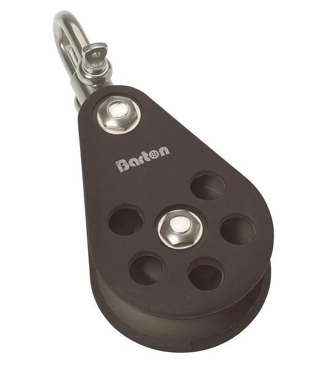id="isPasted">Size 5 54mm Plain Bearing Pulley Block Single Block SwivelThe Size 5 Barton range of blocks has a 54mm 2 1/8" sheave. They are rugged construction, featuring high-grade molded side plates that are through-bolted and riveted for added strength and security. All load-carrying components and interior frame are from marine grade 316 stainless steel and both plain and ball bearing sheaves are available. This sleek and versatile range is engineered for use on larger cruising and racing yachts and is compatible with our ball-bearing mainsheet traveler system. The 54mm sheave Size 4 range is of rugged construction, featuring high-grade molded side plates that are through-bolted and riveted for added strength and security.