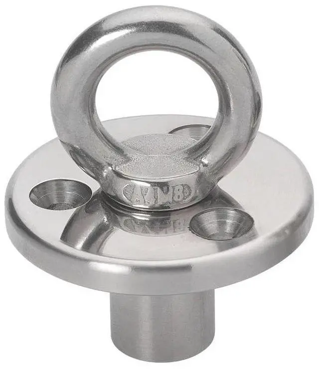 id="isPasted">Deck Plate with Fixing & Eye with Blanking Plug - M8 EyeTurned from solid bar 316 stainless steel with a highly polished finish, the deck plates have a centre anchoring hole in three standard metric thread sizes – M8, M10, and M12, each supplied with a stainless steel blanking plug. Designed to be mounted flush with the deck using three fixing bolts, the sealed internal thread prevents water ingress. The design prevents trip hazards on board when not in use. The range allows for a multitude of uses, including: temporary fixing eyes, boat tie downs, deck mounted boarding ladders, stand up blocks, davit mounts, life raft holders, dive tanks & other endless uses.