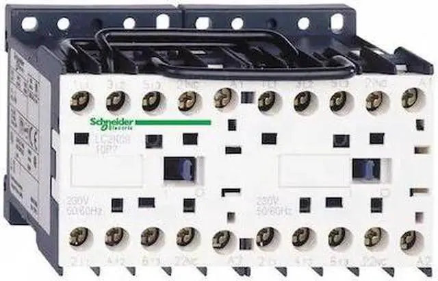 LC2K1210F7 is a compact 3-pole TeSys K reversing contactor from Schneider Electric for motor applications. Rated 12A AC-3 5.5kW@400V, it includes a 110V 50/60Hz AC coil, 2NO auxiliary contacts, a mechanical interlock and pre-wired reversing circuit. LC2K1210F7 is a 3-pole TeSys K reversing contactor from Schneider Electric for simple motor applications rated up to 5.5kW@400V. Very compact, DIN-rail compatible, with connections by screw clamp terminals, it is assembled with a mechanical interlock and a pre-wired reversing circuit. It includes a 110V 50/60Hz AC coil and 2NO built-in auxiliary contacts. Available worldwide, it complies with multi-standards (IEC, UL, CSA, CCC, EAC, Marine). Very compact, 90mm wide, for DIN-rail and panel mounting. Assembled with mechanical interlock and pre-wired reversing circuit. Provides a 110V AC coil compatible 50/60Hz and 2NO built-in auxiliary contact. Can be completed with auxiliary contact blocks (LA1K, LA2K) and thermal relays (LR2K).
