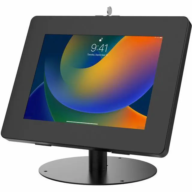 The two words best used to describe this product are secure and convenient. The large enclosures heavy-duty steel exterior protects devices from wear-and-tear while the sturdy lock prevents theft. Soft foam grips throughout the interior keep your device cozy and scratch-free. A hollow center allows neat cable routing directly through the stand itself creating a clean professional look. Two 360-degree swivels - one at the base and one at the mount - which makes this perfect for personable point-of-sale transactions. Use the included galvanized steel locking cable to doubly secure your device. Simply lock one end directly to the stand and tether the other to any permanent fixture.