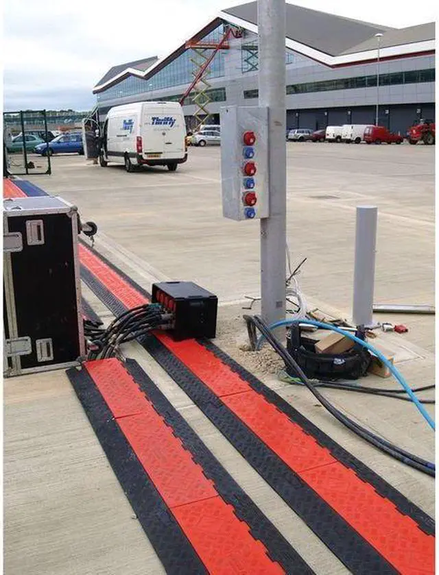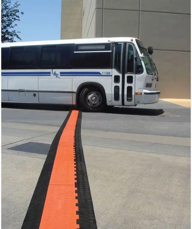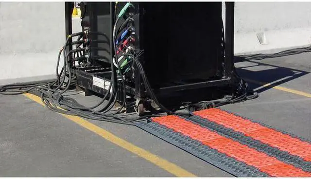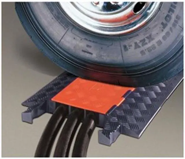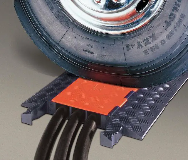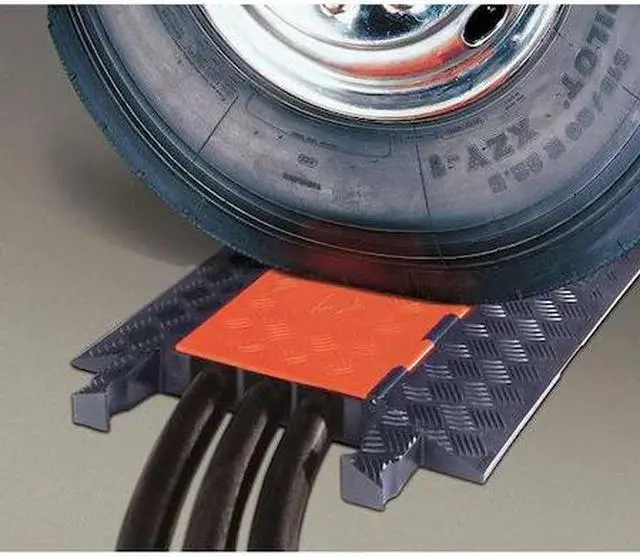 Cable Protector, Number of Channels 3, Cable Feed Style Lay In, Connection Style Dog Bone, Channel Height 2 1/4 in, Channel Width 2 1/4 in, Load Capacity 28, 420 lb/Axle, Material Polyurethane, Style Hinged, Color Black/Orange, For Use With Electrical Cables, Hose Lines, Max. Cable Dia. 2 1/4 in, Height 3 in, Length 38 5/8 in, Width 20 in, ADA Compliant No, Texture Serrated. This item has been restricted from sale in the following state (s): []