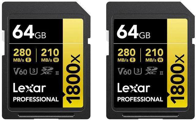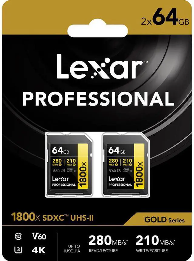 Lexar gold Series Professional 1800x 64gB UHS-II U3 SDXc Memory card, 2-Pack2x Lexar gOLD Series Professional 1800x 64gB UHS-II U3 SDXc Memory card - Lexar Lifetime Limited Warranty High-speed performance - rated UHS Speed class 3 (U3) and Video Speed class 60 (V60) for your Professional DSLR and mirrorless cameras Leverages UHS-II technology to deliver read speeds up to 270MB s capture high-quality images and extended lengths of Full-HD and 4K video with write speeds up to 180MB s Designed for durability