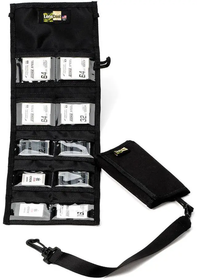 The LensCoat CF10 Memory Card Wallet (Black) holds up to 10 CF cards or 10 QXD cards. The material is a lightweight, waterproof poly tricot/nylon. The wallet secures with a quiet elastic closure and is carried by a clip-on tether. All the interior pockets have clear windows so you can easily see which card you need. In addition, a handy business card slot is provided for that quick networking moment.
