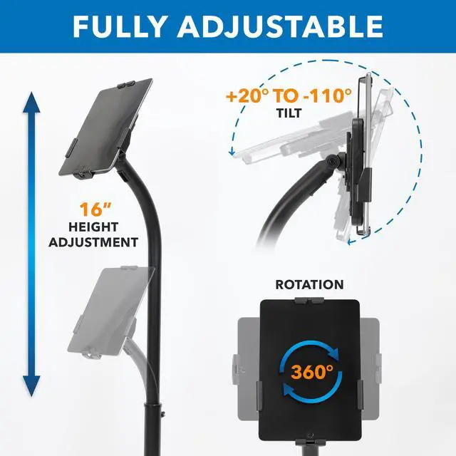 This tablet floor stand is the ideal tablet kiosk for high-traffic public areas such as retail and business environments. Its anti-theft design helps prevent the tablet from being stolen while still offering the full functionality and accessibility to buttons and ports. The pole is height adjustable between 31.1" and 46.85" making the tablet accessible to everyone from adults to children. For additional security and stability, the base can be bolted down to the ground. The fully adjustable head can tilt and rotate, and it features adjustable clamps to fit different tablet sizes from 7.9" to 11". Please measure your tablet to ensure compatibility before purchase.