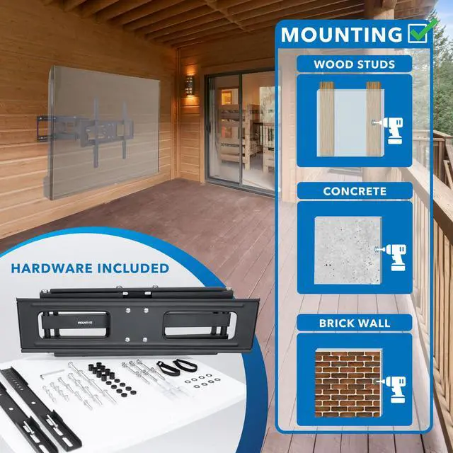 This weatherproof TV mount is specially designed for your outdoor movie night, watching your favorite sport or TV show in the comfort of your own back yard. Powder-coating, electroplating, and stainless-steel hardware ensure your new TV mount will withstand harsh weather conditions, is resistant to rain, corrosion and humidity. The full motion mount will hold TVs between 37 and 80 inches in screen size and securely supports a maximum weight of 110 lbs. To help you find your perfect viewing angle, the mount can swivel 120°, offers a +10/-20° tilt and can be extended up to 20" from the wall.