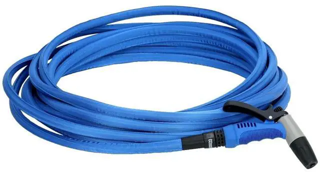 • 25' Blue Flexible Hose Kit with Rubber Tip NozzleHoseCoil Flexible Hose Kits are designed and built for durability. The hose has a 600 PSI rating and is protected by a UV-resistant l0O0D Tetoron fabric outer cover. This material is extremely tough, with excellent resistance to abrasion and fading. It is mold and water-resistant, dries quickly, and is designed to easily slide across surfaces without getting snagged or leaving marks like some traditional garden hoses. The hose fittings are built from non-marring sturdy black plastic, and the spigot fitting features a brass end for added strength. The fittings are field¬serviceable, meaning that they can be disassembled and reassembled if the hose ever needs to be repaired. The included spray nozzle is our popular WNSl0 model with a soft rubber comfort grip and impact-resistant rubber tip to protect surfaces from drop damage. Features:Lightweight and strong600 PSI durable hoseField serviceable fittingsRubber Tip Nozzle included