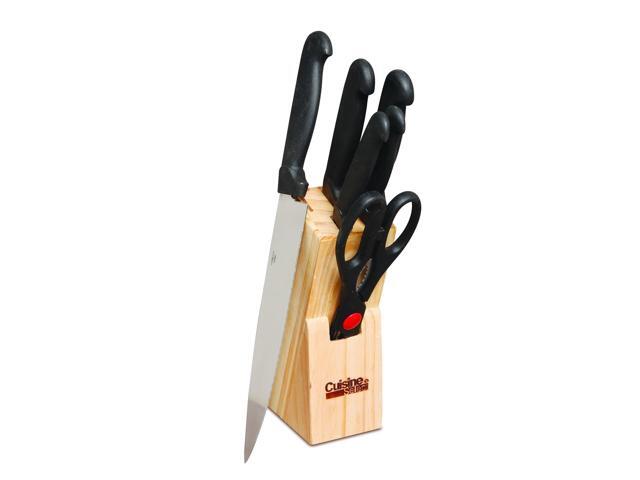 - 7 piece cutlery set includes a chef knife, bread knife, boning knife, utility knife, paring knife, scissors, and woodblock