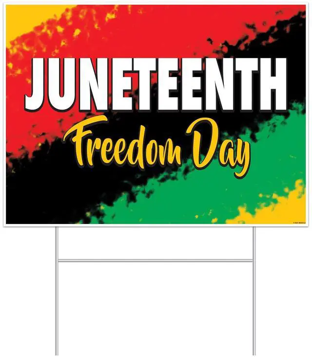 Pack of 6 Plastic Yard Signs for Juneteenth Celebration. These signs are made of durable plastic material, perfect for outdoor use. Show your support and commemorate the historic event with these eye-catching signs. Each pack contains 6 signs, allowing you to decorate your yard or neighborhood with a powerful message of freedom and equality.