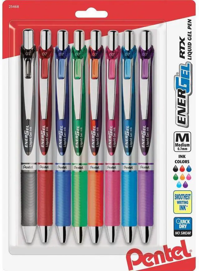 • EnerGel Liquid Gel Pen delivers the ultimate writing experience with a stainless steel tip and super-smooth blend of liquid and gel inks that glide across paper. Liquid gel ink dries so fast even left-handed writers love it - no smears, no smudges and no globs. Acid-free ink formula is excellent for everyday notes yet safe for vital documents. 0.7mm medium tip conveniently retracts to protect pockets and purses. Latex-free grip delivers maximum comfort and control, and the stainless steel accents offer a professional look. Refill with Pentel LR7 or any EnerGel refill.