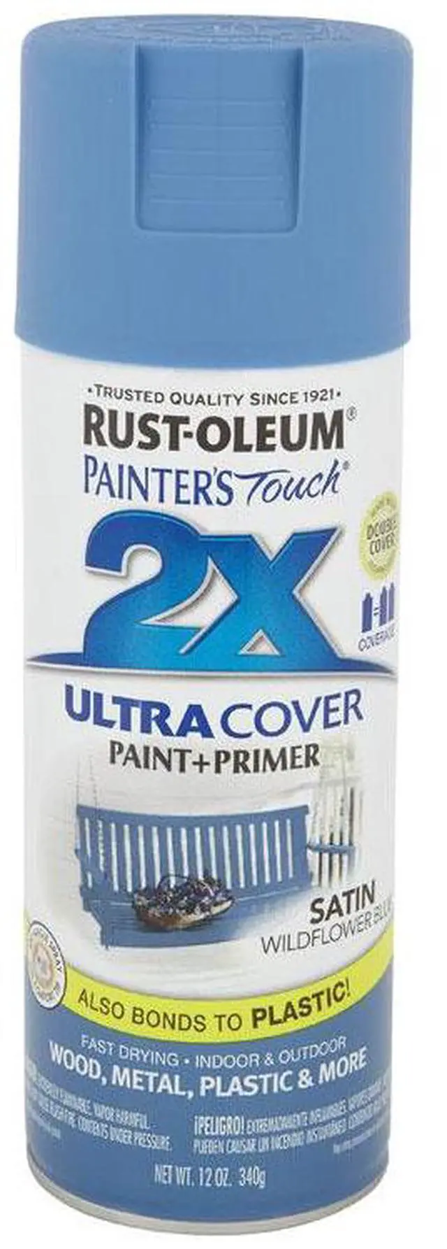 liBrand Name: Rust-Oleum Sub Brand: Painters Touch Ultra Cover Sheen: Satin Color: Wildflower Blue Product Type: Spray Paint Container Size: 12 oz. Primer Required: No Inverted Spray Ability: Yes Indoor or Outdoor: Indoor and Outdoor Time Before Recoating: 1 hr. Coverage Area: 10-12 sq. ft. UV Resistant: Yes Recommended Surface: All Surfaces Clean Up: Mineral Spirits Dry Time: 20 min Mildew Resistant: No Usage: Multi-Purpose liliDepartment - PAINT AND CLEANING SUPPLIESlilimdseClass - SPRAY PAINTSliliprodGroup - GENERAL PURPOSEli