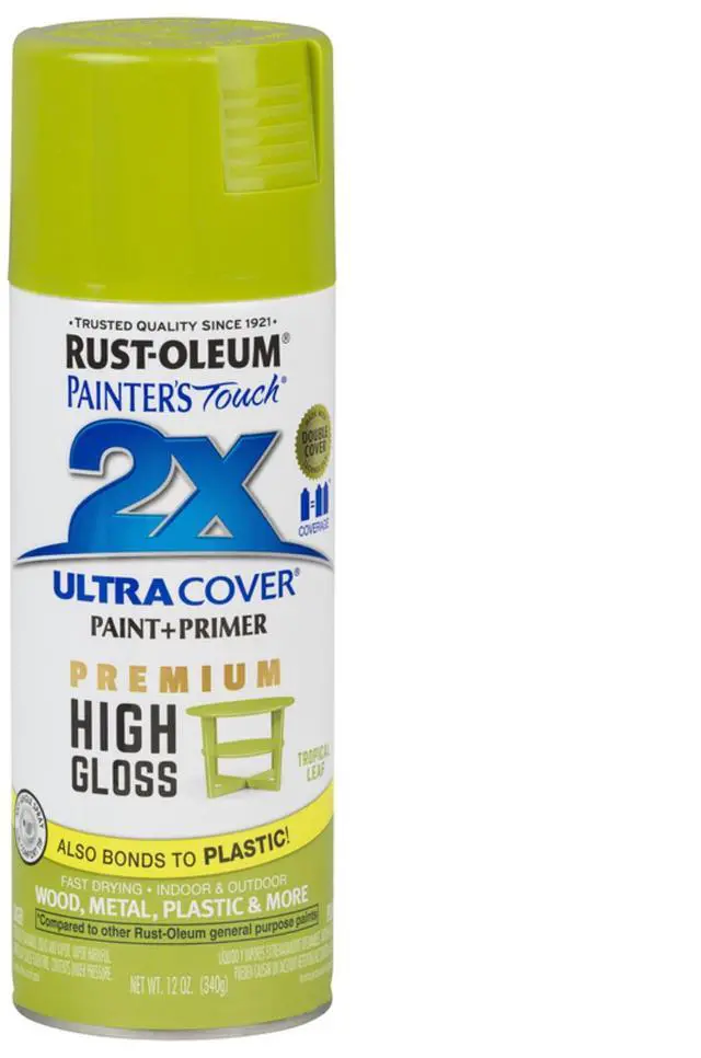 • liBrand Name: Rust-OleumliliSub Brand: Painter's Touch 2X Ultra CoverliliSheen: High-GlossliliColor: Tropical LeafliliProduct Type: Spray PaintliliContainer Size: 12 oz. Primer Required: NoliliRecommended Surface: Wood Metal Plastic and MoreliliTime Before Recoating: 1 hr. UV Resistant: NoliliSkid Resistant: NoliliWater Resistant: NoliliClean Up: Mineral SpiritsXyleneliliInverted Spray Ability: YesliliDry Time: 20 min Coverage Area: 12 sq. ft. Mildew Resistant Finish: NoliliIndoor or Outdoor: Indoor and Outdoor li