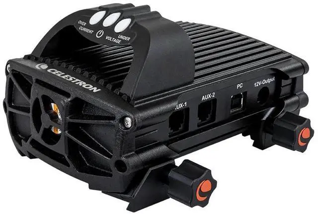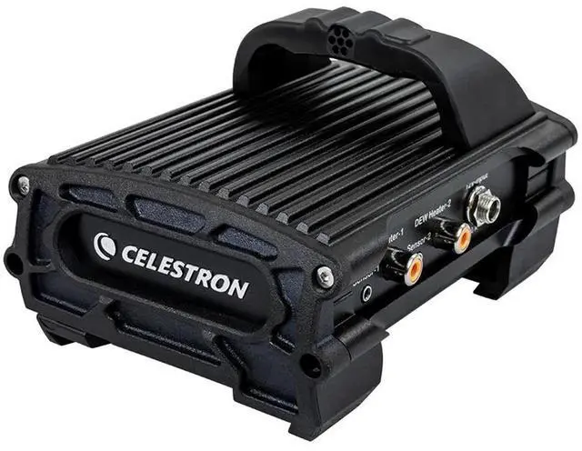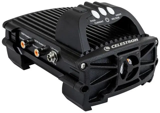 Or if you want to view data from the controller and make manual adjustments you can connect it to your Celestron telescopes hand control or your PC. The controller works with NexStar+ or StarSense hand controls running the latest firmware or Celestron CPWI telescope control software included with every Celestron mount. Power The Smart DewHeater and Controller 2x runs on a 12V DC battery (like our PowerTank Lithium Pro or PowerTank 17) and can handle a maximum power of 120W (10A max current @ 12V DC). The controller also features a 12V DC output port. You can use this extra port to power another device like your mount.
