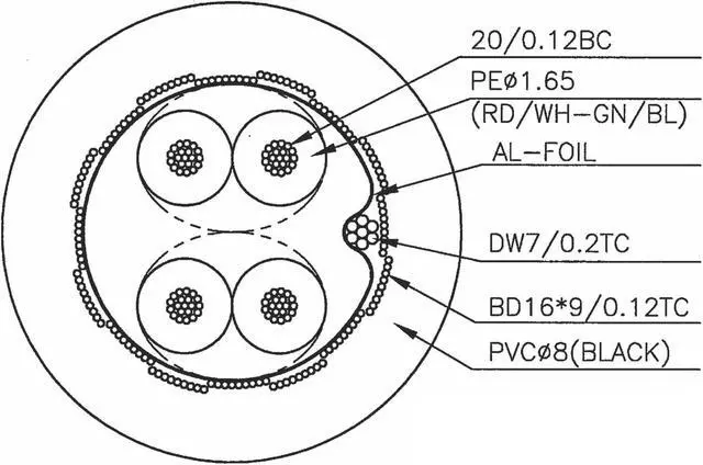 To prevent both RF and EMI interference from entering or radiating from our cables the entire assembly is double shielded first wrapped with a 100% foil cover followed by an aluminum braided sleeve effectively eliminating any stray high or low frequencies leakage. The cable is then finished with a drain wire with an overall 8mm flexible PVC jacket.