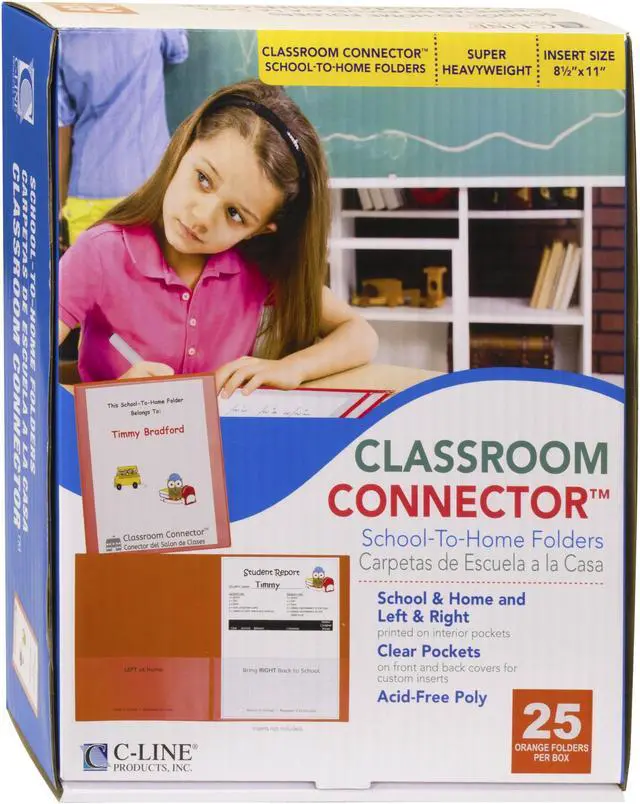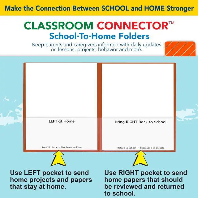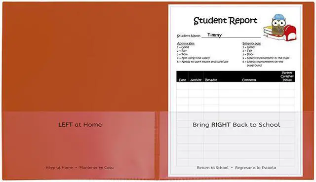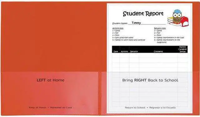Make the connection between school and home stronger with these school-to-home two-pocket folders. Keep parents and caregivers informed with daily updates on lessons, projects, behavior and more. The interior pockets are imprinted with 'Home' and 'School' designations, in both English and Spanish. Front and back cover pockets are clear, making them great for custom student cover sheets. Made of durable, acid-free polypropylene. Orange.
