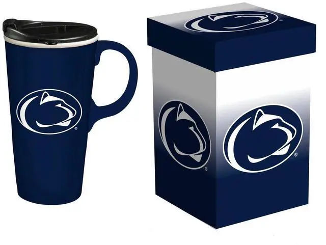 17 oz. ceramic travel cup with a handle and leak proof lid is suitable for hot or cold liquids. | Flip top plastic lid fits cup tightly with three rings of silicone. | Coordinating gift box is included, making gift giving easy. | Fits most standard car cup holders. | Perfect for sports fans.