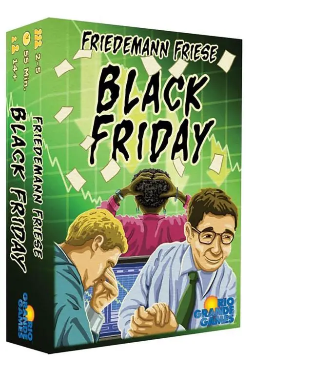 pBLACK FRIDAY - Try to gain as much gold as possible by dealing in shares before the huge stock market crash. Try to earn enough cash by cleverly buying and selling shares, so you can spend it on the coveted precious metal. If you are the best in manipulating the market development and share prices, you have the biggest chances to win the game. Black Friday offers an independently acting opponent, the M. I. B. S. (minimally intelligent broker service). Depending on the number of players you have, you may be able to opt to play with or without the M.