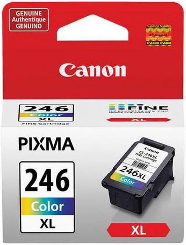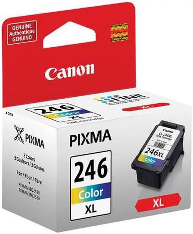 The Canon CL-246 XL High Capacity Color Ink Cartridge for PIXMA MG2420 and MG2520 features smudge-resistant ink. The cartridge yields 300 pages based on ISO standards and features Canon's FINE (Full Photolithographic Inkjet Nozzle Engineering) technology.