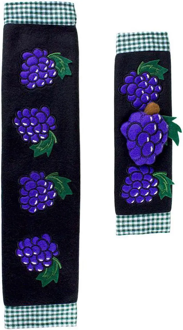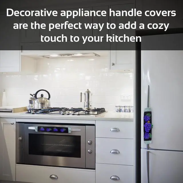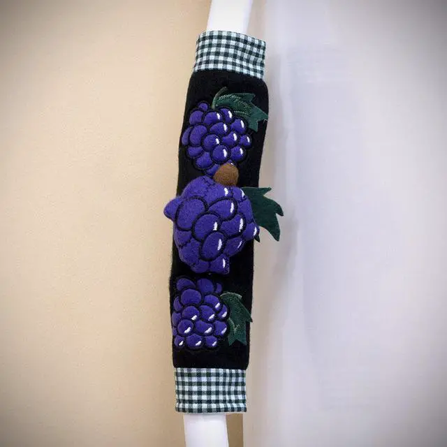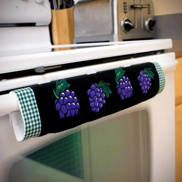 Add a cozy touch to your kitchen with this Set Of 2 Kitchen Appliance Handle Covers W/ Grape Design. Each cover is made from soft felt and features grape appliques along the front with gingham trim on both ends. The set includes two covers, with a longer 15.75 inch cover designed for oven handles and a shorter 10 inch cover that can be used on either refrigerators or microwaves. All the covers secure with a simple hook and loop closure along the back, making it easy to put on and take off the covers whenever you want.