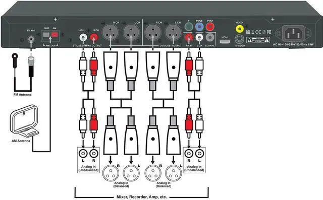 Equipped with modern technology, the Astatic MP200 supports a wide range of connections, including FM and AM antenna connections, two unbalanced RCA stereo pairs, two balanced XLR stereo pairs, and composite, component, and HDMI video outputs. This ensures compatibility with a multitude of devices and displays, offering you the flexibility to enjoy your media the way you want.
