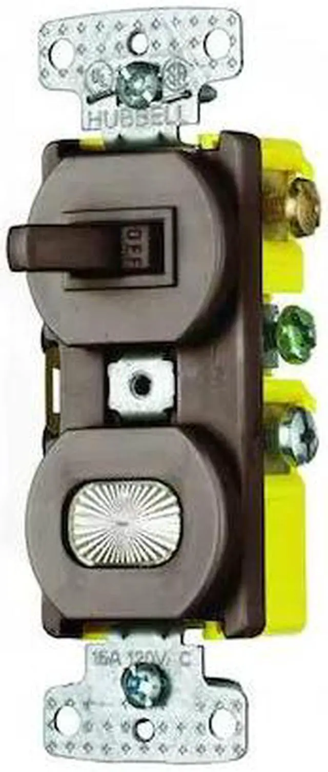 Combination Device, Current Rating 15 A, Device Type Switch and Pilot Light, Housing Color Brown, Mount Type Flush, NEMA Receptacle Configuration 5-15R, Number of Poles 1, Pilot Light Yes, Switch Style Toggle, Switch Type Single Pole, Voltage Rating 120V AC, Wiring Method Side, Grounding Grounded, Includes Mounting Hardware Yes, Mount Hole Center-to-Center Height 3.27 in, Number of Gangs 1, Standards UL Listed, Wire Connection Type Screw Terminals. This item has been restricted from sale in the following state (s): []