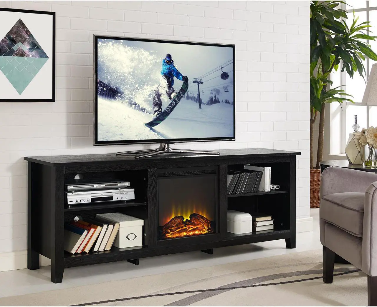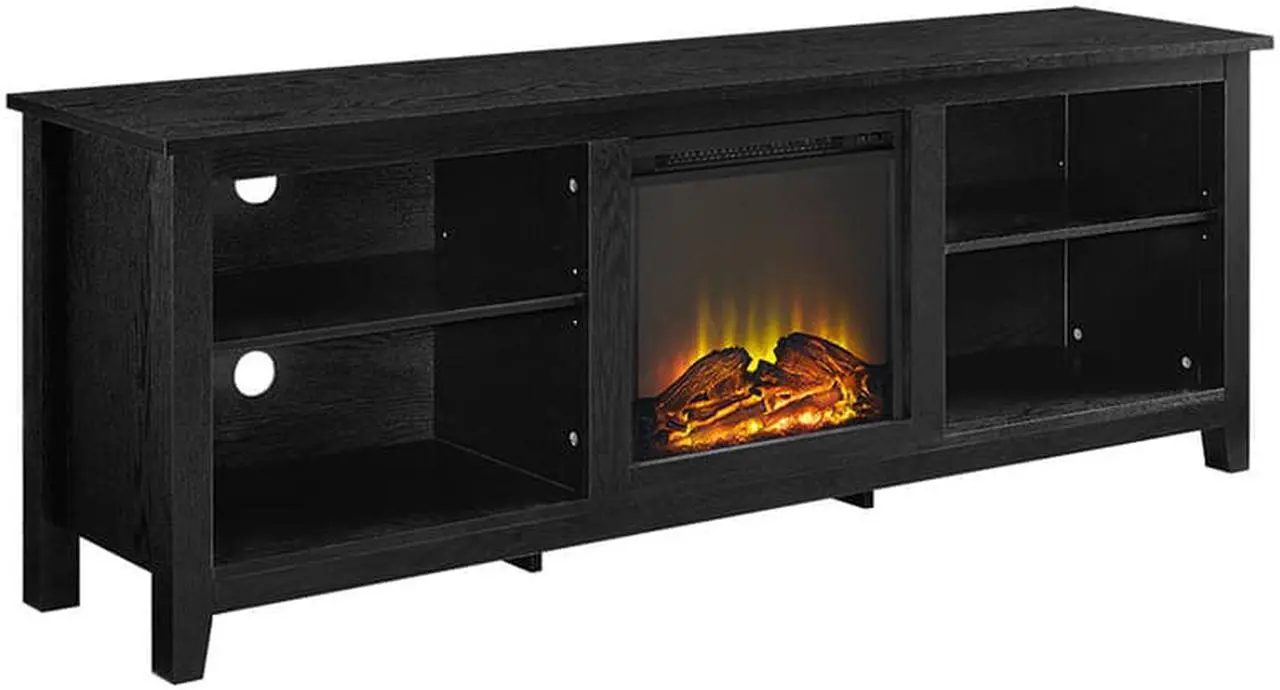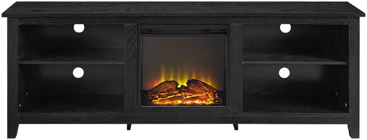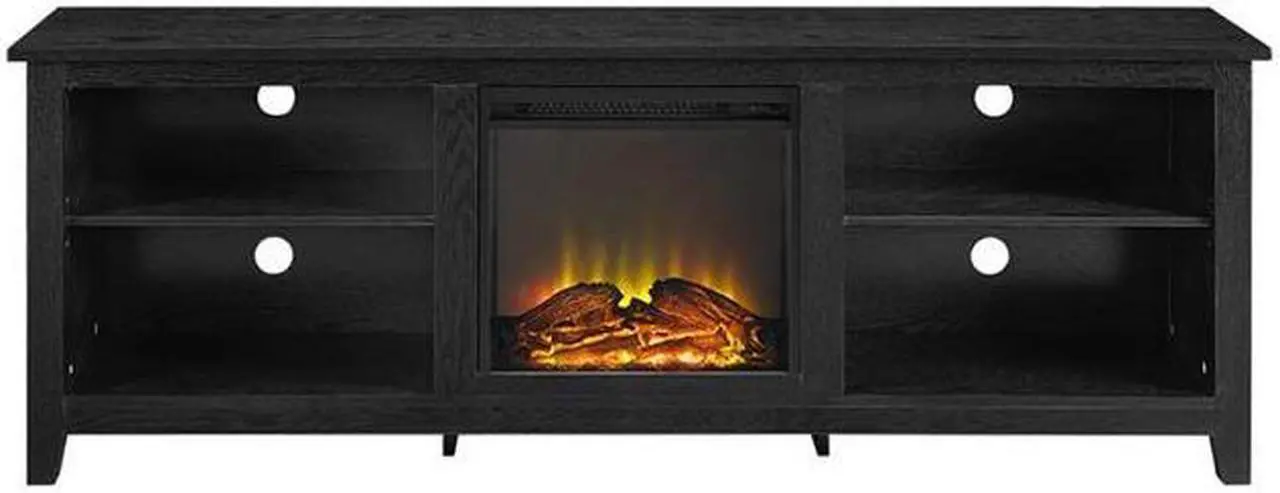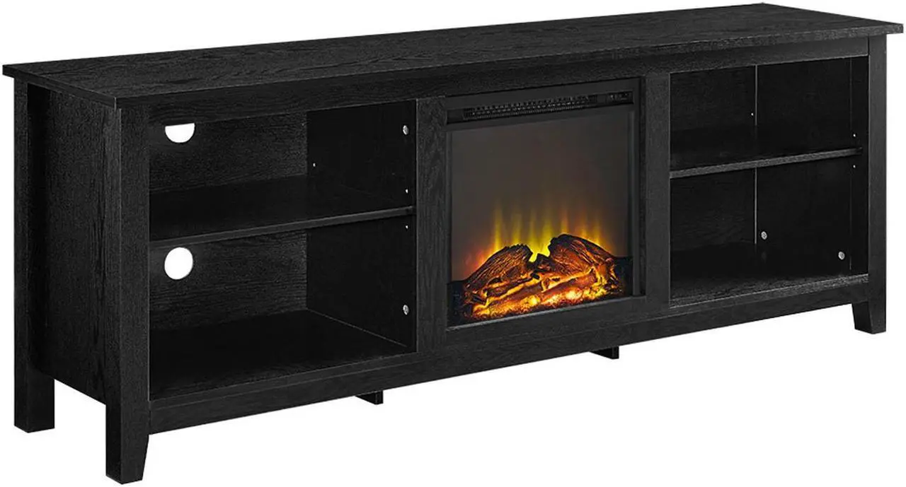 W70FP18BL 70" Black Wood Fireplace TV Stand, Create a warm, entertaining space in any room of your home with this wood media stand with electric fireplace. Crafted from high-grade MDF with a durable laminate finish to accommodate most flat panel TVs up to 70 inches. Features adjustable shelving to fit your components and a cable management system. Installation requires no technician, simply plug into standard household outlet and no venting required. Rich, textured finish High-grade MDF and durable laminate Supports up to 250 lbs. Includes electric fireplace insert No electrician required, simple plug-in unit Accommodates most TVs up to 70 inches Adjustable shelving Ample storage space Ships ready-to-assemble with step-by-step instructionsDimensions: 70" W x 16" D x 24" HWeight: 102 lbs.