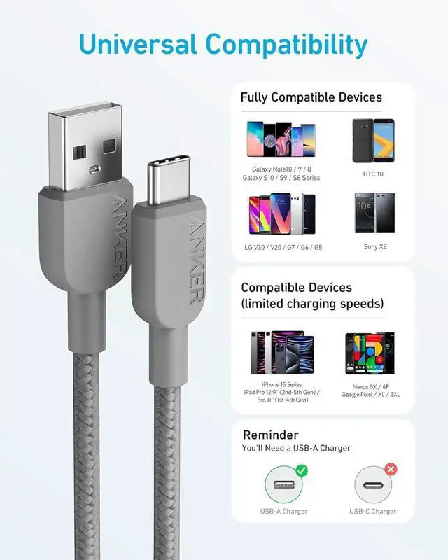 The Anker Advantage: Join the 80 million+ powered by our leading technology Reliable charging: USB-IF compliant for safe, reliable charging for virtually any USB-c device Built to Last: Proven in strict laboratory tests to withstand up to 10,000 bends Fast Sync & charge: Supports fast charging up to 15W (3A5V) and data transfer speeds up to 480Mbps (Not compatible with Power Delivery) What You get: Anker 310 USB-A to USB-c cable (6 ft Braided) - 2 pack, our worry-free 24-month warranty, and friendly customer service