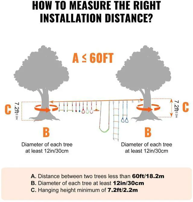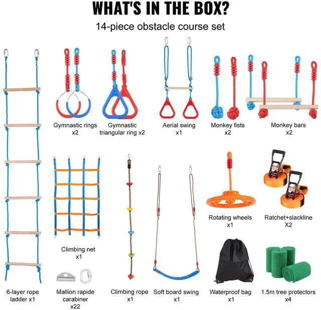 Abundant Accessories: The ninja warrior obstacle course includes: 2x60-foot slacklines, 4 tree protectors, 1 climbing net, 1 climbing ladder, 2 gymnastic rings, 2 monkey bars, 2 monkey fists, and 2 swings. The diverse accessories are perfect for training different strengths in children. This product also comes with a storage bag for your convenience during picnics. | Comprehensive Ninja Training Course: Designed specifically for children aged 4 and older, the outside ninja course challenges them with various obstacles to overcome through climbing, jumping, grabbing, and pulling. It helps unleash their natural instincts while training their strength and balance. Suitable for installation in backyards, playgrounds, home gyms, basements, swimming pools, fitness studios, camping, or beach parks. | Adjustable Obstacle Distances: The weatherproof slacklines in the kit are not fixed; users can adjust the distances between them to suit children of different heights. It's also suitable for pare