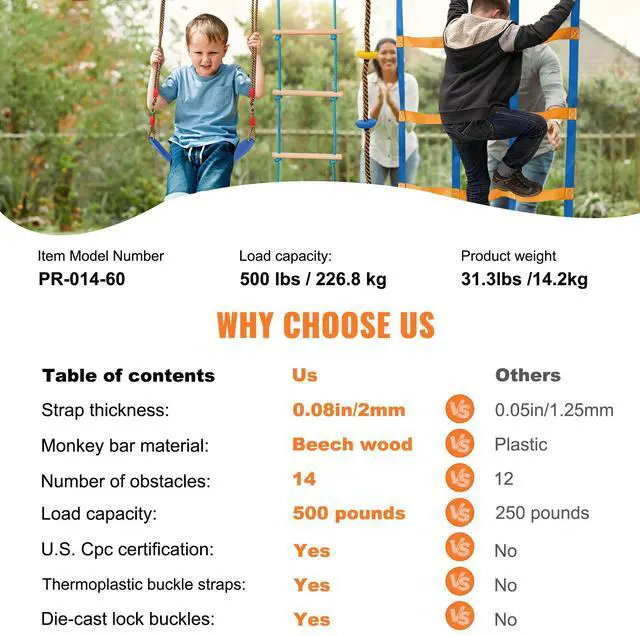 VEVOR Ninja Warrior Obstacle Course for Kids, 2 x 60 ft Weatherproof Slacklines, 500lbs Weight Capacity Monkey Line, Outdoor Playset Equipment, Backyard Toys Training Equipment Set with 14 Obstacles