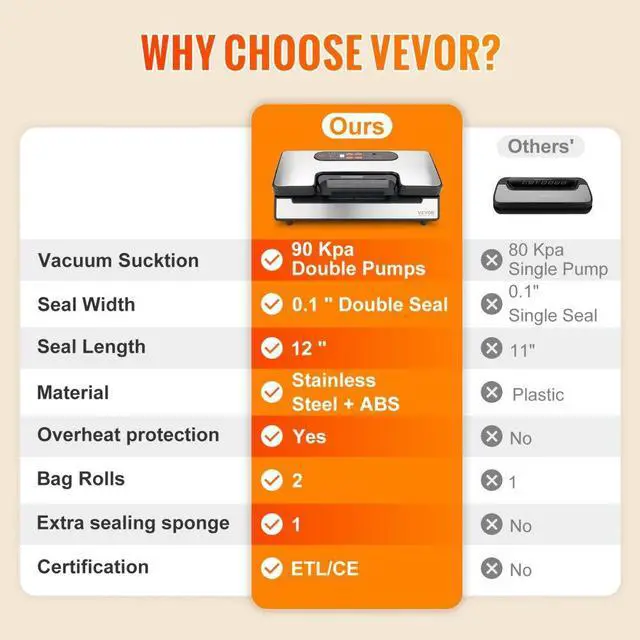 Vacuum Sealer MachineFast Sealing & Multi-function & Easy OperationIntroducing VEVOR's vacuum sealer machine! It will become your ultimate kitchen companion that keeps your food fresh and delicious for longer! This powerful machine is a must-have. With a specially designed cooling system it's built to handle continuous and repetitive use without overheating. Plus the multifunctional panel lets you customize the sealing process for different types of food. Say goodbye to freezer burn and hello to perfectly preserved food! Seal the deal with VEVOR!