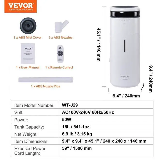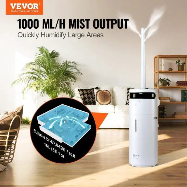 VEVOR Humidifier for Home Large Room, Commercial Humidifier for Whole House 1291.7 sq ft, 16L Water Tank & Night Light & 12h Timer & Auto Shut-Off, Greenhouse, Commercial Branch Tube w/ 360 Nozzle