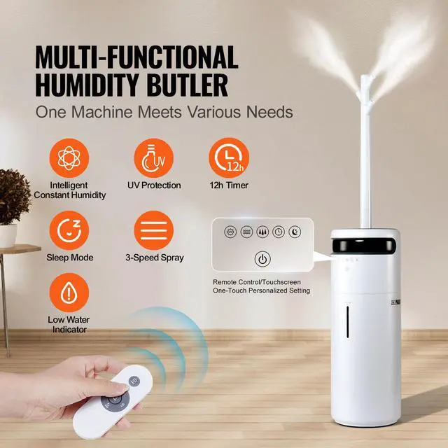 16L Large Capacity & High Mist Output: The 16L large capacity humidifier provides long-lasting humidity management, allowing you to meet your humidification needs for the entire day with a single refill. The 750ml/h high mist output can add moisture to a large area, suitable for spaces as large as 1,291.7 square feet. | Multi-Function & Remote Control: The digital touch control and remote control are combined into one, making your operation more convenient and flexible. UV light purifies the water mist, and it features a 1-12 hour timer and a sleep mode that won't disturb your rest. When the water tank is running low, it will sound an alarm and automatically shut off for added safety. | Smart Humidifier with Customized Humidity: The humidifier can adjust humidity between 45% to 90% and has three mist levels: low for quiet sleep or small spaces, medium for hot summer days or medium-sized rooms, and high for winter or large areas to quickly add moisture. | User-Friendly Design: The water