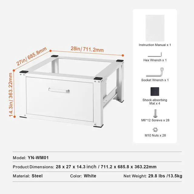 Sturdy And Durable Noise-Reducing Washing Machine Pedestal Constructed With Spcc Cold-Rolled Steel, Our Pedestal Holds Up To 660 Lbs (299.4 Kg), Elevating Your Machine By 16 Inches (406.4 Mm) For Waist-Level Access, Reducing Strain. It Also Offers Storage For Laundry Essentials, Promoting A Clutter-Free And Organized Space. This Pedestal Completely Addresses Issues Like Excessive Vibration, Loud Noise, And Easily Damaged Bases, Providing A Lasting Solution To Common Washing Machine Problems. After Purchasing This Washing Machine Pedestal, The Top Priority Is The Ease Of Installation, Allowing Users To Quickly Set It Up And Enjoy The Benefits Without Delay. When It Comes To Choosing The Right Size For Appliances Like Refrigerators Or Washing Machines, It'S Often Challenging To Find A Suitable Fit. With This Pedestal, You Can Say Goodbye To Size-Related Frustrations. Elevate Your Washing Machine Off The Floor And To A More Ergonomic Working Height, Reducing The Need For Excessive Bending And Minimizing Strain On Your Back And Knees.