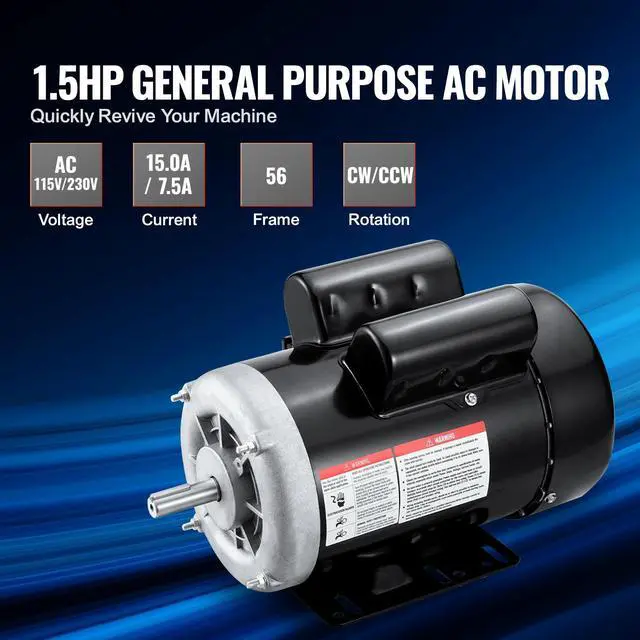 Power Up Fast: Revive Your Machine Now Inject Powerful Performance Into Your Equipment With The Vevor 1.5Hp Electric Motor. Operating At 115V/230V Voltage With 15.0/7.5A Current, It Features 3450 Rpm High Speed, 56 Frame, 1.88-Inch Shaft Length, 5/8-Inch Keyed Shaft, And Cw/Ccw Dual Rotation Direction. Vevor 1.5Hp Electric Motor Boasts A High Speed Of 3450Rpm, Delivering Powerful Performance Across Various Applications. Its Robust Power Output Ensures Efficient Operation, Making It Ideal For Agricultural Machinery And Industrial Equipment While Saving Energy And Boosting Productivity. Featuring Cw/Ccw Dual Rotation Direction, This Air Compressor Motor Is Easy To Install And User-Friendly. With A 5/8-Inch Shaft Diameter, 1.88-Inch Shaft Length, And 0.188-Inch Keyway, It Easily Connects To Diverse Equipment, Offering Great Versatility For Different Applications. Constructed With A Heavy-Duty Rolled Steel Shell, The General Purpose Motor Is Resistant To Rust And Corrosion, Ensuring Long-Lasting Durability. Our General Purpose Ac Motor Is Perfect For A Wide Range Of Applications, Including Water Pumps, Sprayers, Harvesters, And Grinders. Whether For Agricultural Or Industrial Use, This Motor Meets Your Needs And Supports Your Projects With Dependable Performance.