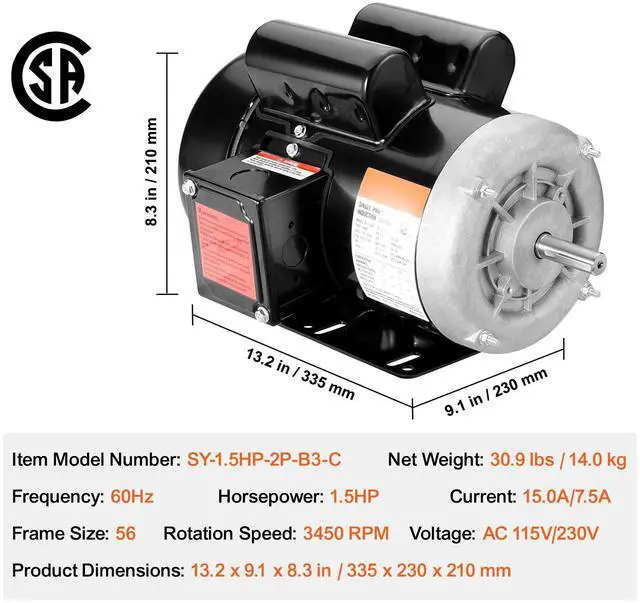 1.Powerful Performance: 1.5Hp, Single Phase, Full Load Current: 15.0/7.5A, Ac 115V/230V 60Hz, 3450 Rpm High Speed, Sf: 1.15.