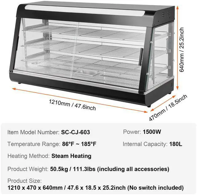 2.3-Tier Large Space: Dimensions: 47.64 X 18.50 X 25.20 Inch / 1210 X 470 X 640 Mm. Our Countertop Food Display Case Features 3 Spacious Food-Grade Shelves, Allowing You To Place Different Sizes Of Food Freely. It Is Ideal For Holding And Storing Pizza, Egg Tarts, Fried Chicken, Or Burgers, Ensuring The Food Stays Fresh For A Long Time.