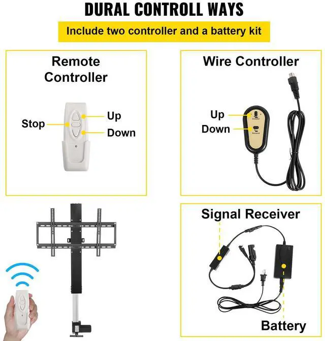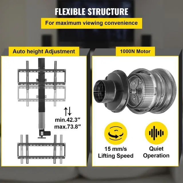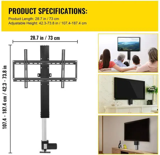 : Motorized TV Lift Bracket Are you searching for a new way to lift/down your TV? Our upgraded electric TV lift stand flexibly control the lift or down in 2 ways: wireless remote control or wire-connected hand controller. It was mounted on the wall or ground, compatible with various TV types. Auto Lift/Down Height Compatible TV Sizes Aluminum Alloy Structure Easy Installation Tough Equipment & Tools, Pay LessVEVOR is a leading brand that specializes in equipment and tools. Along with thousands of motivated employees, VEVOR is dedicated to providing our customers with tough equipment & tools at incredibly low prices. Today, VEVOR has occupied markets of more than 200 countries with 10 million plus global members. Why Choose VEVOR? Premium Tough QualityIncredibly Low PricesFast & Secure Delivery30-Day Free Returns24/7 Attentive ServiceTough Equipment & Tools, Pay LessVEVOR is a leading brand that specializes in equipment and tools. Along with thousands of motivated employees, VEVOR is dedicated to providing our customers with tough equipment & tools at incredibly low prices. Today, VEVOR has occupied markets of more than 200 countries with 10 million plus global members. Why Choose VEVOR? Premium Tough Quality Incredibly Low Prices Fast & Secure Delivery 30-Day Free Returns 24/7 Attentive Service @media screen and (max-width: 750px)