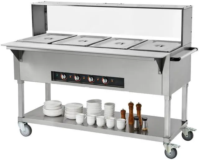 Acrylic Sneeze Guard: We have improved overall food safety by adding a clear sneeze guard to the front of the buffet server. It effectively protects the food from moisture and droplets in the air, ensuring a safer dining experience for all guests. 4 flexible casters (including 2 lockable) offers easy movement and stable positioning. 5.