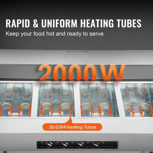 Warmth: Keep your dishes warm and ready to serve with VEVOR 2000W commercial electric food warmer! Featuring independent knob switch and 304 stainless steel heating tubes in each well, our steam table delivers powerful heating for uniform and rapid heat transfer, preserving the hot and delicious flavors of your food for longer.