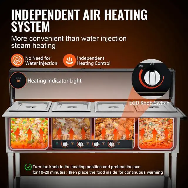 Independent Heating System: One knob switch controls one food pan. You can set the temperature independently for each pan to ensure optimal freshness and flavor. Our food warming table operates without the need for water, using air heat transfer for safe and convenient heating. Preheat for 10-20 minutes before heating delicious food. (This steam table is intended only for dry use). 4.