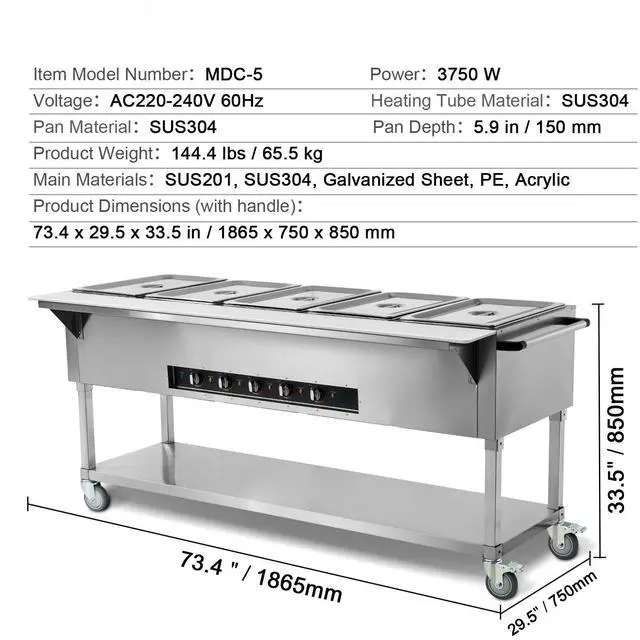 : Warmth That Lasts, Delight That Persists Keep your guests satisfied with piping hot food with VEVOR electric food warmer. Featuring independent heating control and 5 spacious food wells, 3750W efficient heating and effortless mobility, this table ensures that your food stays hot and delicious, delighting your guests with every bite. Our steam table features 5 x 20.6 QT large food wells, allowing you to serve different dishes at once! Each well is 5.9 inches deep and comes with a lid and handle for easy access to food for your guests.