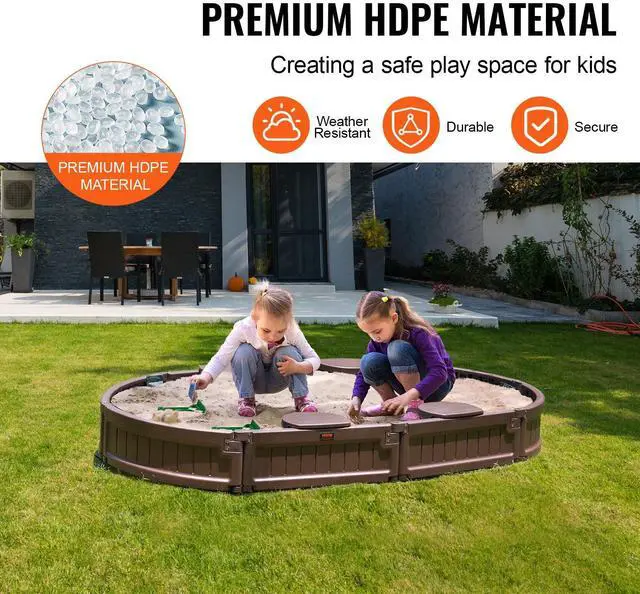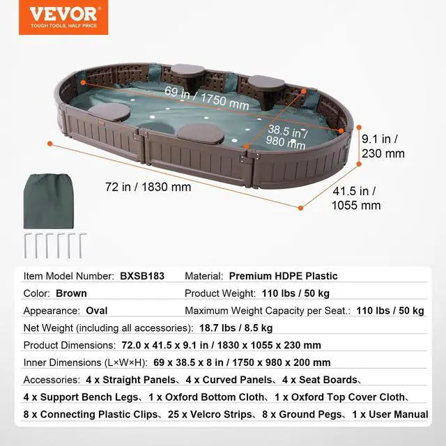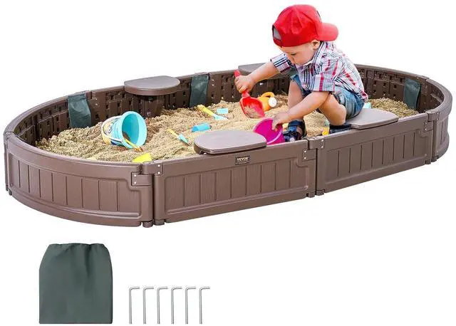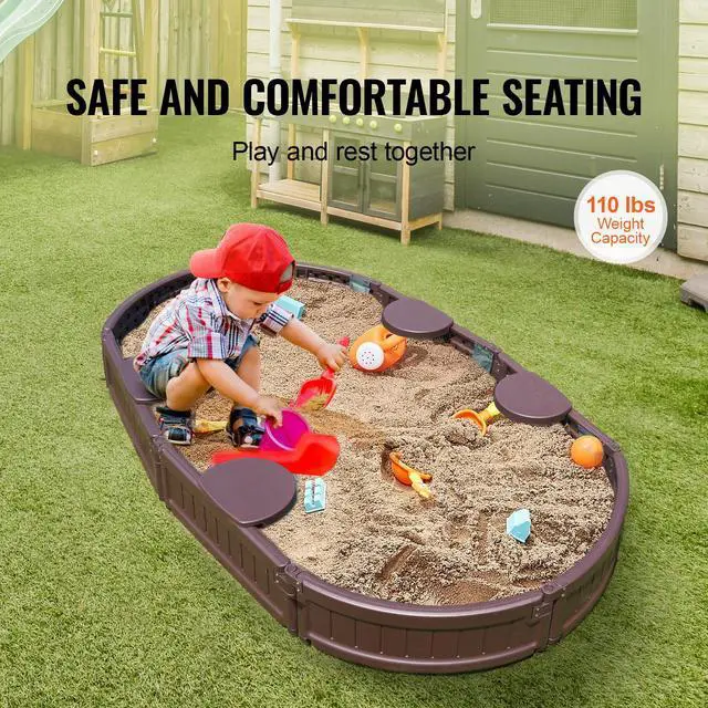 : Unleash Joy and Imagination in Our Sandbox! With dimensions of 72 x 41.5 in the sand box can accommodate 2-4 children aged 3-12 playing simultaneously. This spacious design turns your backyard into a mini playground, enhancing children's interaction, cooperation, and social skills, and fostering teamwork and communication. The sandbox with cover features 4 corner seats where children can rest when they are tired, preventing them from sitting directly on the sand for a cleaner and more comfortable experience. Each seat supports up to 110 lbs, providing a secure and enjoyable play environment for children. Installing the sand pit requires no complex tools and can be easily completed by one person. It comes with detailed installation instructions, allowing you to set up the sandbox quickly by following our tutorial. The perforated bottom liner promotes drainage and ventilation inside the sandbox for kids, preventing the sand from becoming damp. Kids can also adjust the sand depth according to their preferences. When not in use, the sand cover can prevent the sand from being blown away. Our kids outdoor sandbox can transform into a playground and social space in the backyard, on the beach, or at the park.