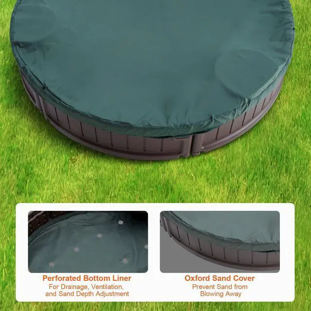 Sand Cover: The perforated bottom liner promotes drainage and ventilation, preventing the sand from getting wet. When the sand pit is not in use, the sand cover can be placed over it to keep the sand clean and dry and prevent it from blowing away. 5.