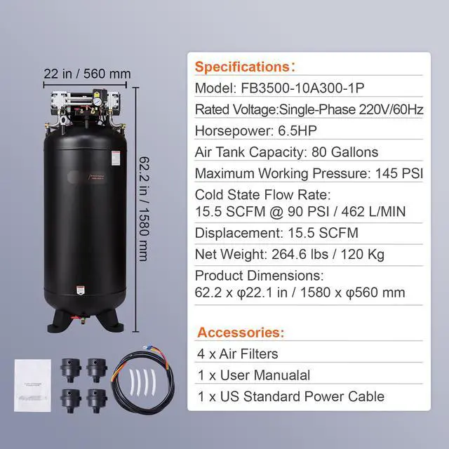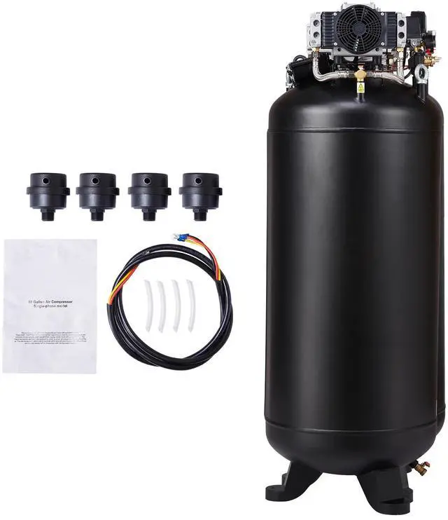 Versatile Applications: Perfect for a range of pneumatic tools, from nail guns to spray guns, this air compressor provides a stable air supply for woodworking, industrial manufacturing, and workshop tasks (Compatible with 220V/60Hz single-phase power)Details: Boost Your Productivity with Steady Air Supply! VEVOR 80 Gallon stationary air compressor is your ultimate solution for diverse pneumatic needs, whether in industrial manufacturing or construction sites. Featuring a 6.5 HP 2-stage motor and delivering 15.5 SCFM at 90 PSI, it ensures reliable performance for a wide range of applications. Our compressor tank is made from high-strength cold-rolled steel and has undergone rigorous safety performance testing. It demonstrates exceptional durability and reliability, effectively preventing gas leakage and ensuring a safe and dependable air source. 80 Gallons super large capacity provides a longer duration of stable air supply for your production and daily tasks, preventing potential production accidents and failures caused by unstable air pressure. Consistent air source to keep your operations running smoothly. This oil-free air compressor utilizes an electric motor to drive the rotation, compressing and delivering compressed air to various equipment. It provides the required compressed air and eliminate pollution issues, wear issues, and maintenance difficulties caused by oil lubrication. Our air compressor tank offers a wide range of applications, perfectly meeting the diverse needs of home and commercial uses.