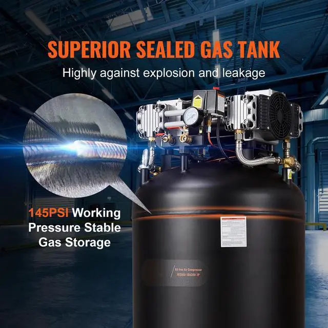 Down: VEVOR 86dB low-noise stationary air compressor utilizes oil-free technology, significantly reducing operational sound interference, minimizing disruptions in your work environment and improving your work efficiency4.