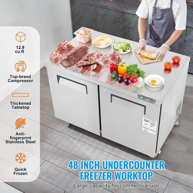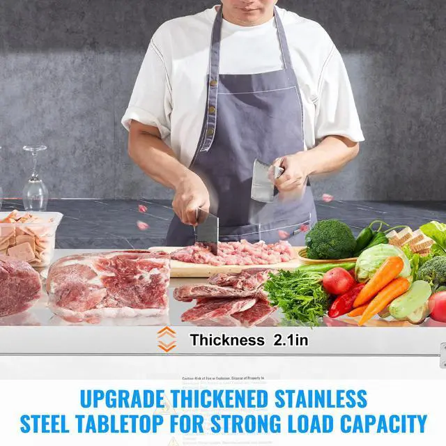 48" Sandwich/Salad Frozen Prep Table This frozen prep table is made entirely of corrosion-resistant stainless steel. The 2.1" thick countertop allows you to chop vegetables, cut meat, and prepare various foods, meeting your different work needs. The 12.9 Cu.Ft frozen refrigerator features adjustable shelves for dual-zone storage. The LED temperature control display allows for real-time monitoring and adjustment of the internal temperature, adjustable between 0~-8°F / -18 ~ -22℃. The high-quality compressor is energy-efficient while providing excellent cooling performance, ensuring stable refrigeration even during hot summer days. The cabinet door automatically closes within a 75° angle without needing to be pushed, enhancing food preservation and energy efficiency. This refrigerated prep table is suitable for fast food restaurants, dessert shops, beverage stores, food trucks, bakeries, and more.