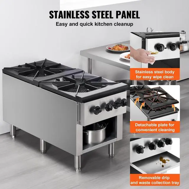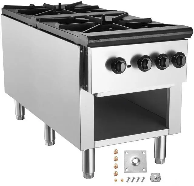 Commercial Gas Stove with 2 Burners Our gas stove features direct flame coverage for even heating across the entire pan. Intense heat and fast warming make it an essential tool for chefs, ensuring quick meal preparation. The commercial gas stove has 2 burners for independent cooking. Choose your desired burner, ignite instantly, and use the ergonomic knob for effortless control. Cook a variety of dishes with ease. The factory default is natural gas. If you need to use propane gas, please replace the accessories in the accessories pack yourself. Scratch-resistant, durable stainless steel panel wipes clean effortlessly. Removable drip tray and burners are easy to clean, ensuring no oil or waste is left behind. No-hole installation for immediate use. With storage cabinet, the gas stove is ideal for restaurants and food establishments. Perfect for institutional kitchens, school cafeterias, large hotels, company canteens, chain restaurants, and mid-sized eateries.